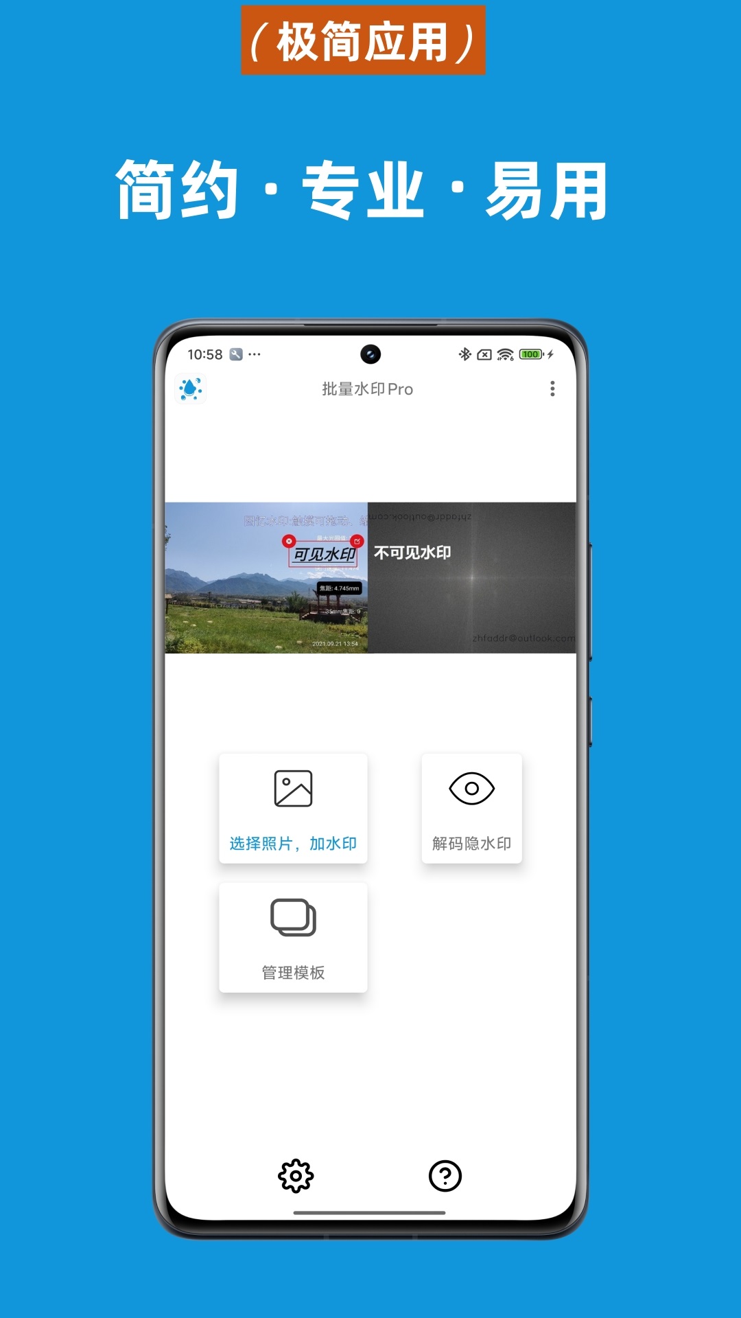 批量水印Pro(原名:图忆水印),是一款能在手机上一键为批量图片添加多种多层水印的专业免费批量图片加水印工具软件。 【免费使用】 无需登录、无需会员、无需vip,终身0费用使用全部功能。 【水印类型】 Exif自动标记水印:可为批量照片一键标记专属拍摄地点、时间等; 隐形水印:可以为图片加入视觉不可见的防盗水印、图片溯源水印; 贴图水印:可以为批量图片生成图中图,图片拼接、图片层叠等; 文字水印:标记图片,说明图片,并且可以从各种方面个性化水印。 【易用】 只需三步,选图->编辑水印->保存。即可完成成千上万张图片一次加水印。 ********* 详细介绍: 【创建水印】 创建全新水印(文本,图像,Exif数据水印、隐藏水印);使用历史水印模版创建。 【编辑水印】 预览,移动、删除、透明度、角度、位置、模式、内容、字体、粗体、斜体、大小、颜色、背景色、水印占图宽度、水印和背景内边距、单行和多行等 【Exif水印】 拍摄时间、拍摄地点、曝光时间、焦距...等各种拍摄参数;自动经纬度转地址。 【隐形水印】 通过对图片进行图像频域加密算法,加入视觉不可见水印,也叫:盲水印、暗水印、数字水印... 【批量选照片】 比较照片选对焦好的照片,图片搜索功能,一键全选等功能. 【压缩保存】 支持原画质保存与智能压缩双模式,支持自定义压缩,支持保留EXIF数据,支持逆地理编码功能... 【默认水印】 自定义图片默认加入的水印,可选加入或不加入默认文本水印,拍摄地址,拍摄时间;还可以对默认水印进行多方面设置。 【所见即所得】 基于视觉比例的自适应算法,自动校准水印位置,确保输出水印的位置、尺寸及视觉效果与编辑界面精准一致。 ******** 小提示: #批量图片保存时,专属水印和模板水印 进行批量图片加水印时,每张照片可编辑自己的专属的独特水印:已编辑专属水印的图片,批量加水印过程中水印不会被覆盖;没编辑自己水印的图片,以当前预览图片的水印为模板,加和预览图片一样的水印。